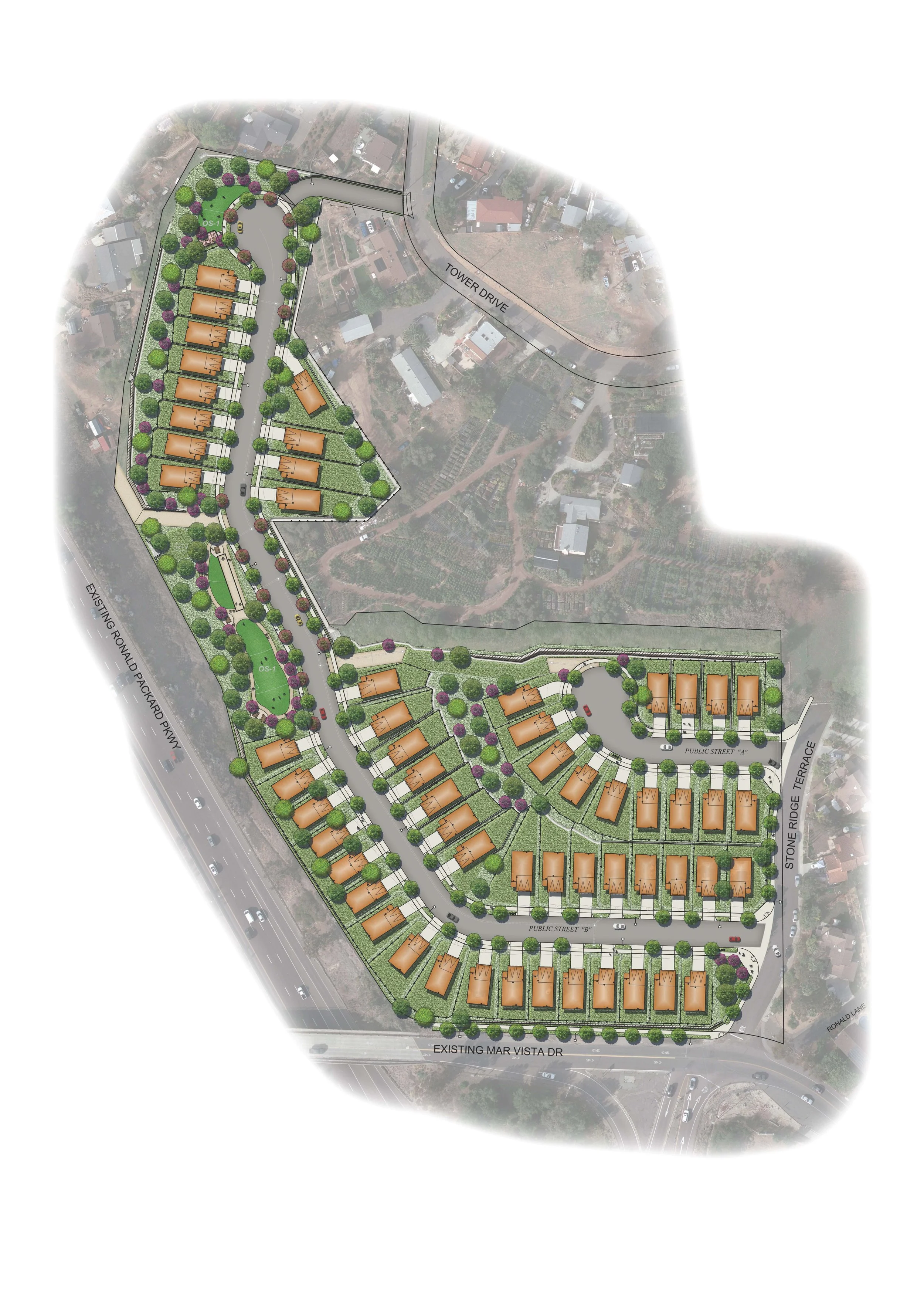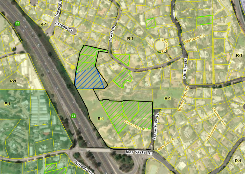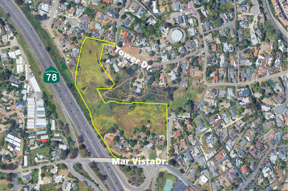 The project site is comprised of several parcels, totaling 11 acres. It is bordered by the 78, Mar Vista Drive, Stoneridge Terrace and Tower Drive. Existing development in the area generally consists of single family residential (pictured left below).