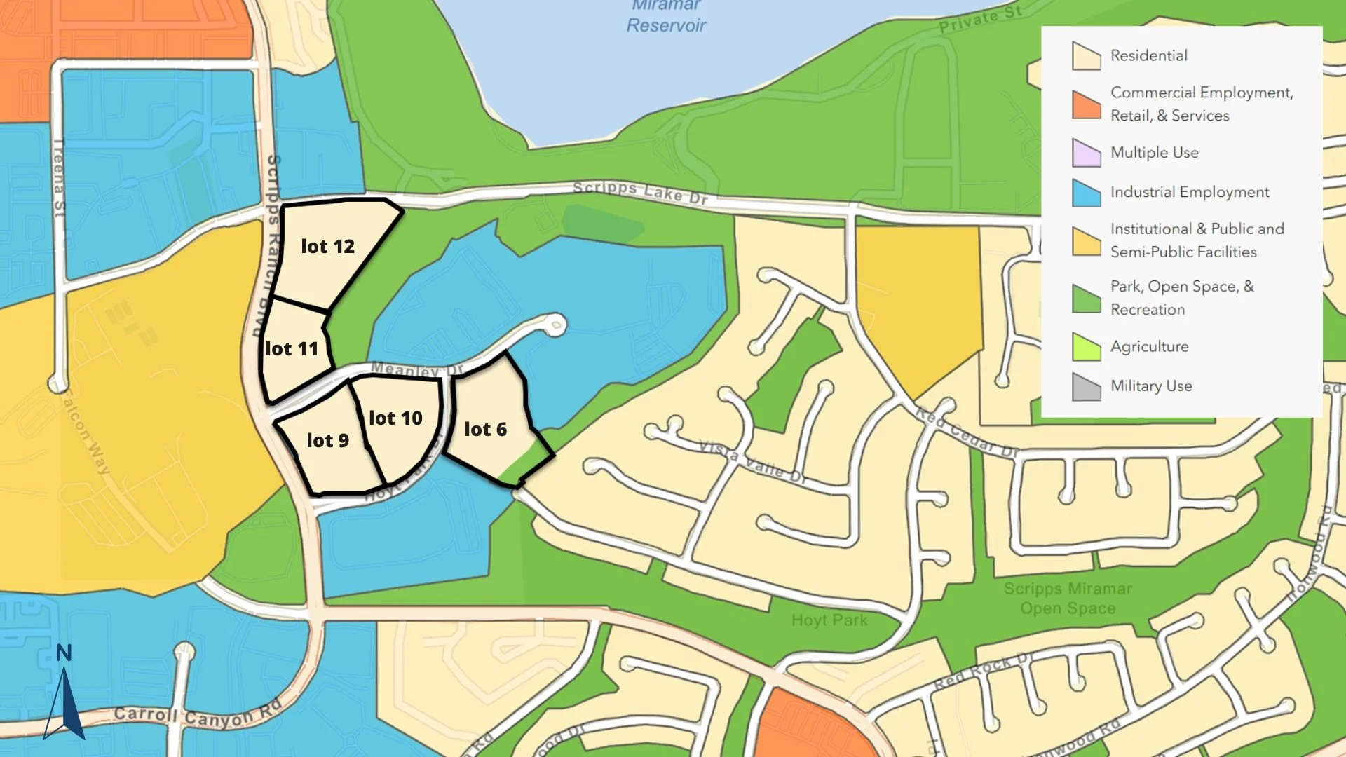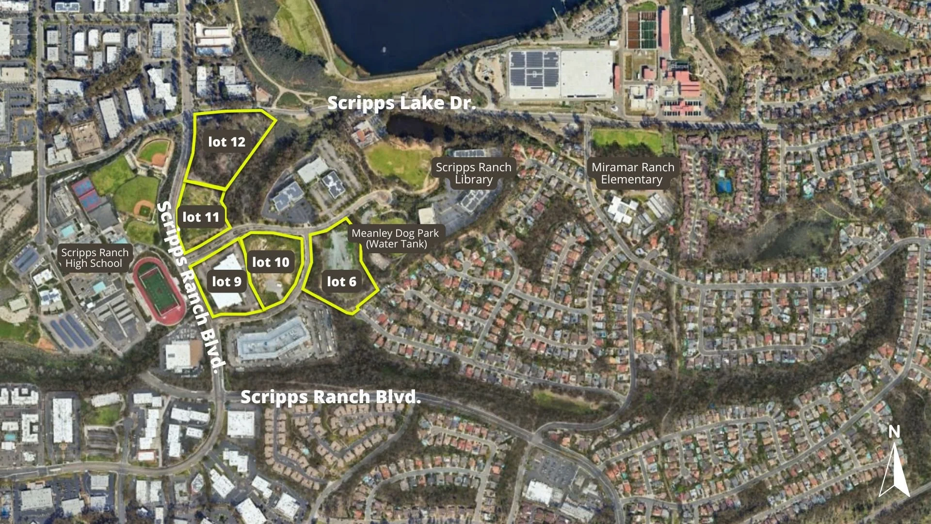 The project site is comprised of five parcels (lots 6, 9, 10, 11 and 12), totaling 23 acres. It is bordered by Scripps Ranch Blvd. and Scripps Lake Drive. Meanley Drive bisects lots 9 and 11.